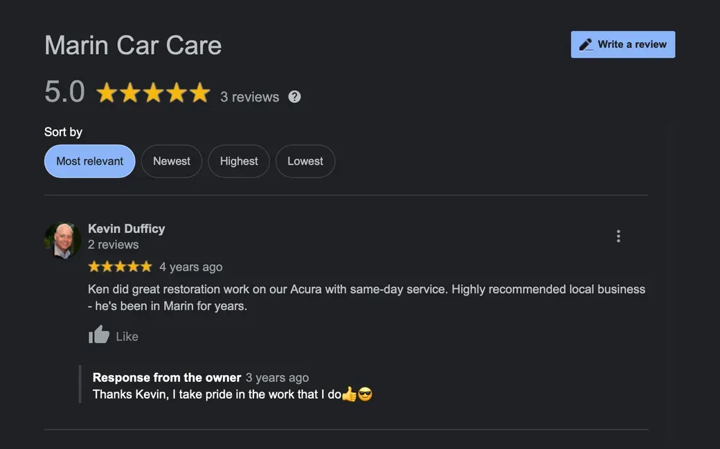 Book your appointment today to keep your vehicle looking flawless. My name is Ken Stavropoulos and I have been operating Marin Car Care for 30 years, and always do all of the work